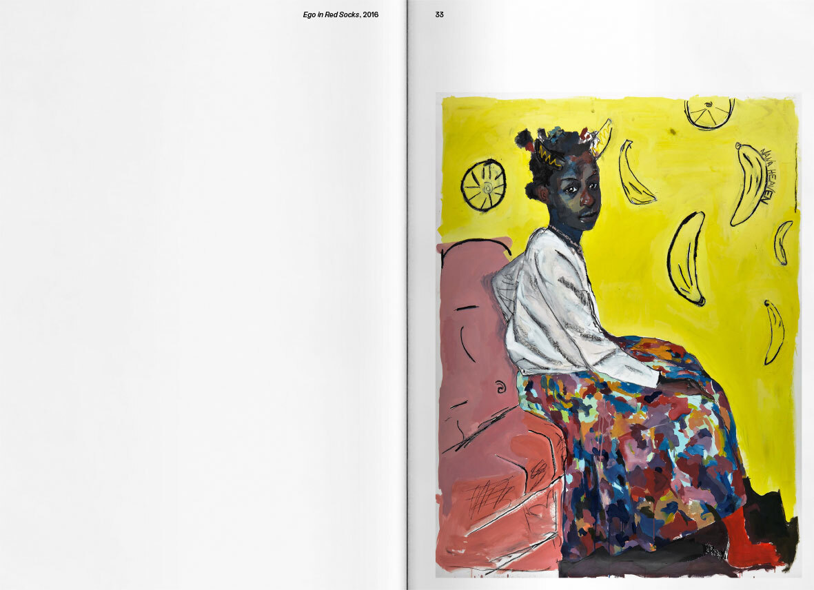 Kudzanai-Violet Hwami (*1993, Zimbabwe) combines visual fragments in her paintings, revealing a multi-layered and personal vision of life. She experiments with photographs and digital image collages, using them to create large-scale works on paper or canvas with intensely pigmented oil paint, often employing other media and techniques such as silkscreen, pastel or charcoal. She draws her inspiration from a variety of sources, including archival, online or nude images, but also personal photographs, such as self-portraits or family pictures.