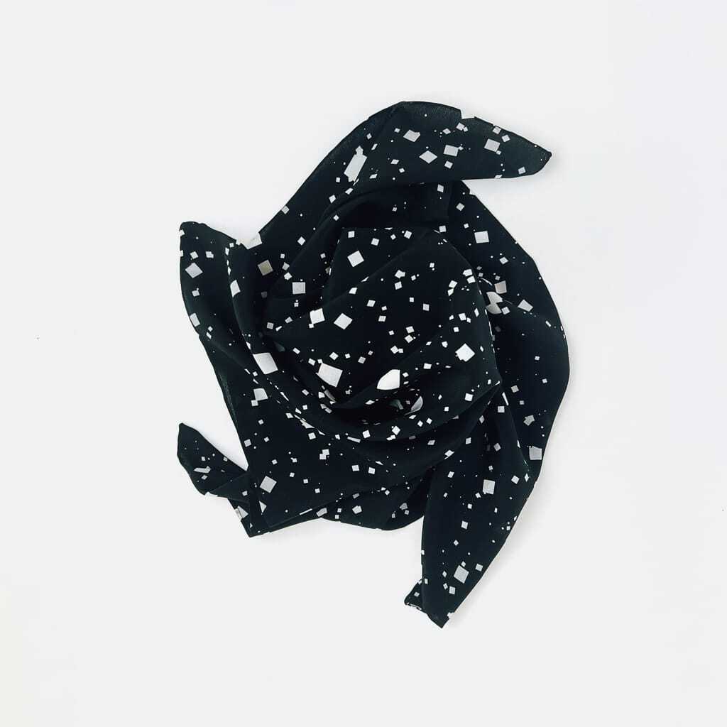 Flora Miranda, the avant-garde designer known for blending fashion with technology and art, collaborates with visual artist Esther Stocker to bring cosmic geometry into wearable form. The Galaxy Scarf captures the essence of Stocker’s signature geometric style, translated into a luxurious 65 cm x 65 cm silk accessory. With hand-rolled seams and intricate cosmic patterns, this scarf is not just a bold fashion statement but also an embodiment of Flora’s vision to merge abstraction and high fashion into everyday elegance.
